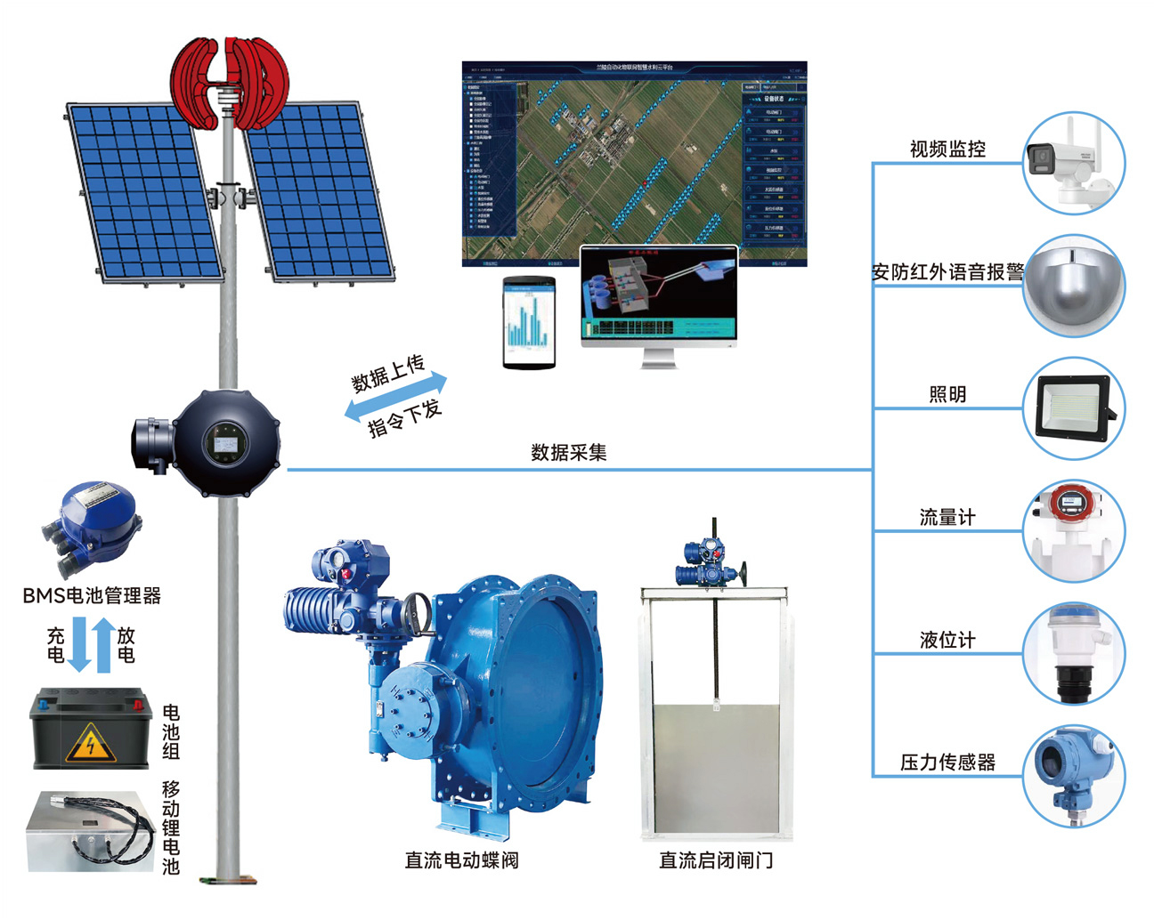 通過(guò)現(xiàn)場(chǎng)PLC控制箱、遠(yuǎn)程自診斷功能軟件和移動(dòng)版手機(jī)APP實(shí)現(xiàn)管控,采用4G、光纖等通信遠(yuǎn)傳測(cè)控信號(hào)等數(shù)據(jù)至互聯(lián)網(wǎng)遠(yuǎn)程監(jiān)控。是解決水利、灌區(qū)等引水管道、渠道上閥門、閘門控制和監(jiān)控量測(cè)等自動(dòng)化和信息化供電問(wèn)題的最佳方案